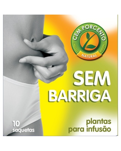Cem Porcento Chá de Infusão Sem Barriga, composto por plantas benéficas à normalização do ritmo de evacuação intestinal, alterado pela vida sedentária e habitual carência de fibras na alimentação quotidiana. Está também indicado na obstipação orgânica e psicogénica.