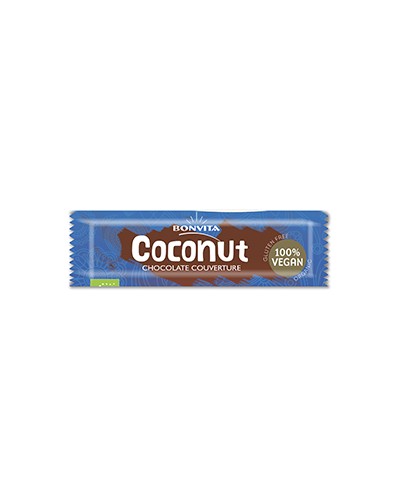 Barra de Chocolate Negro e Coco Bonvita BIO 40g. Sem glúten. Vegan. Ingredientes: Coco* (40%), xarope de milho*, chocolate (20%) (açúcar de cana*, manteiga de cacau*, xarope de arroz em pó*, emulsionante: lecitina de girassol*), xarope de arroz em pó*. *de produção biológica.Pode conter vestígios de leite, amendoim e frutos de casca rija. NL-BIO-01. Origem: UE/não UE. Teor mínimo de cacau: 34%