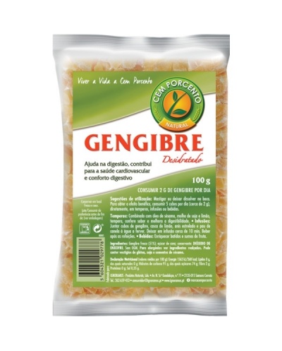 Cem Porcento Gengibre Desidratado em Cubos, raiz de sabor forte e picante, estimula a circulação, ajuda na digestão e é benéfico na saúde cardiovascular. Eficaz no alívio de enjoos, dores menstruais e de garganta, é recomendado a ingestão de 5 cubos por dia, diretamente, em temperos, ou bebidas.
