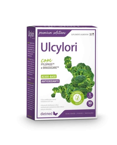Ulcylori é um suplemento alimentar cuja fórmula contém fitonutrientes, probióticos, vitaminas e minerais. Estes ajudam a manter a mucosa gástrica e duodenal íntegra, além de diminuir a carga de Helicobacter pylori, sendo útil em caso de úlceras.